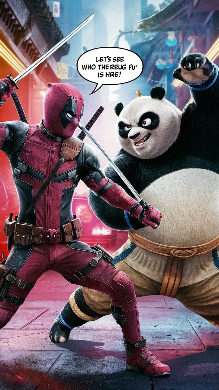 The Epic Battle Begin– Po and Deadpool meet in an epic showdown.– Po uses his Kung Fu to attack Deadpool.– Deadpool counters with his quick moves and weapons.