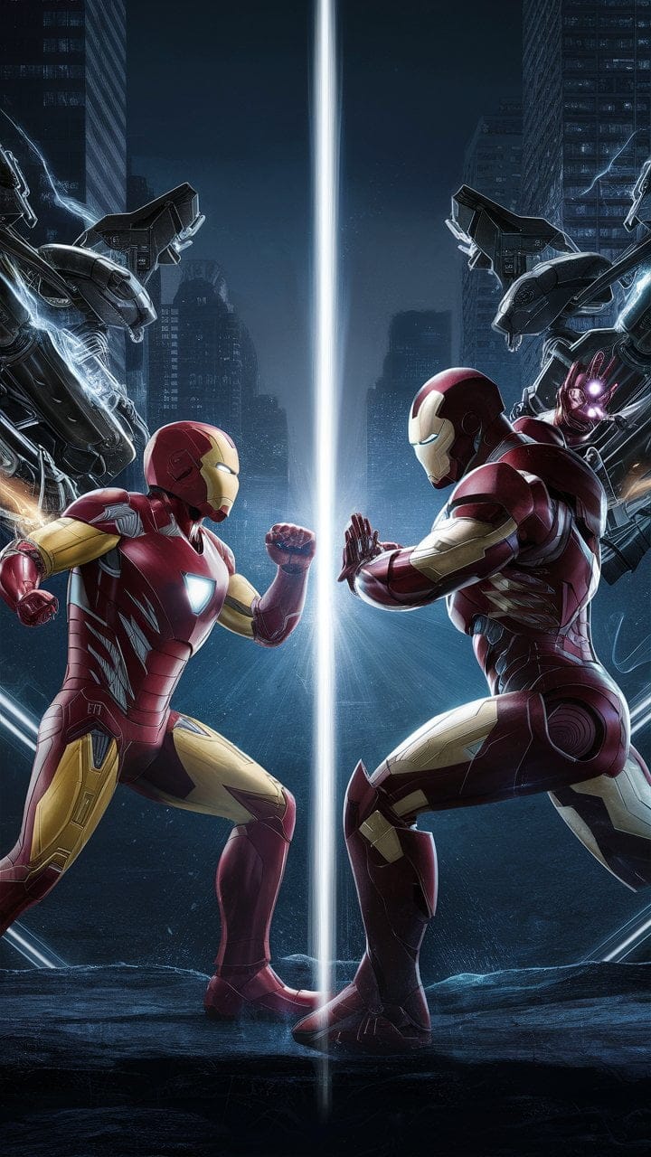 The fight between Superior Ironman and Ironman is intense. Both use their suits to the max, showing off their skills and technology.
